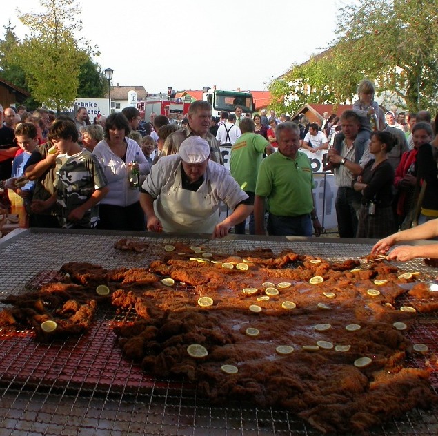 Eine besondere Aktion war im September die Herstellung des größten Schnitzels der Welt. Aus einem Schwein wurde ein Schnitzel mit einer Diagonale von 3,46 Meter geschnitten, paniert und in einer Riesenpfanne gebacken. |